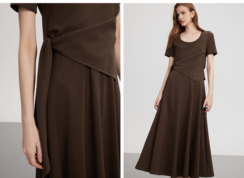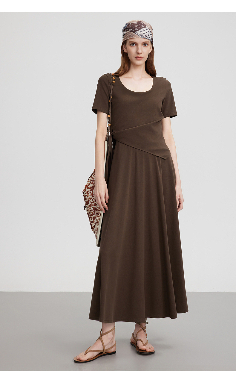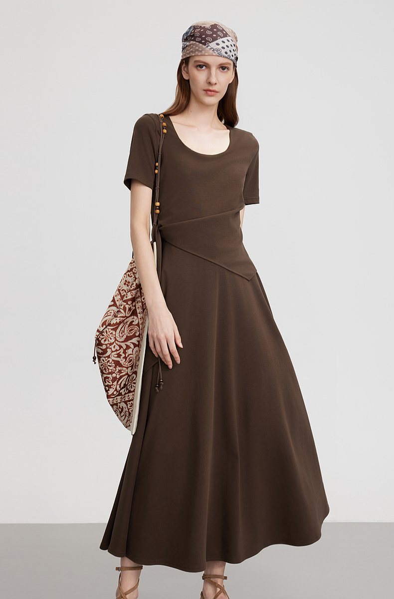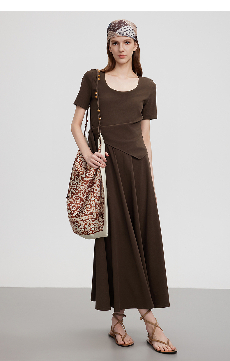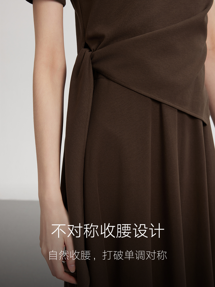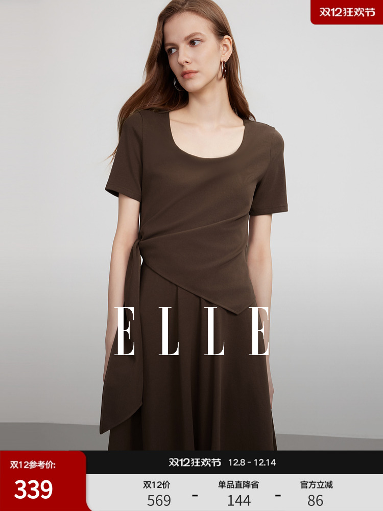 ELLE法式简约不规则连衣裙女2025夏季新款设计感咖色复古收腰长裙
