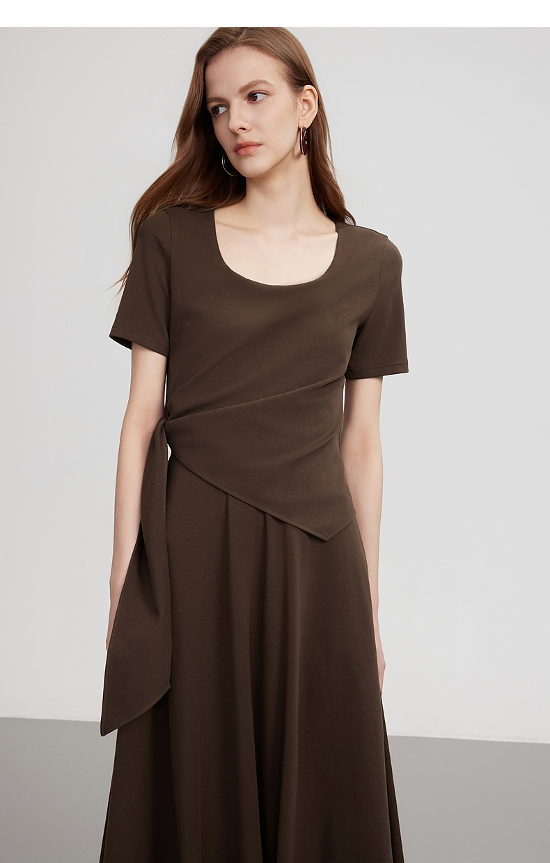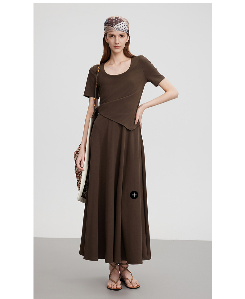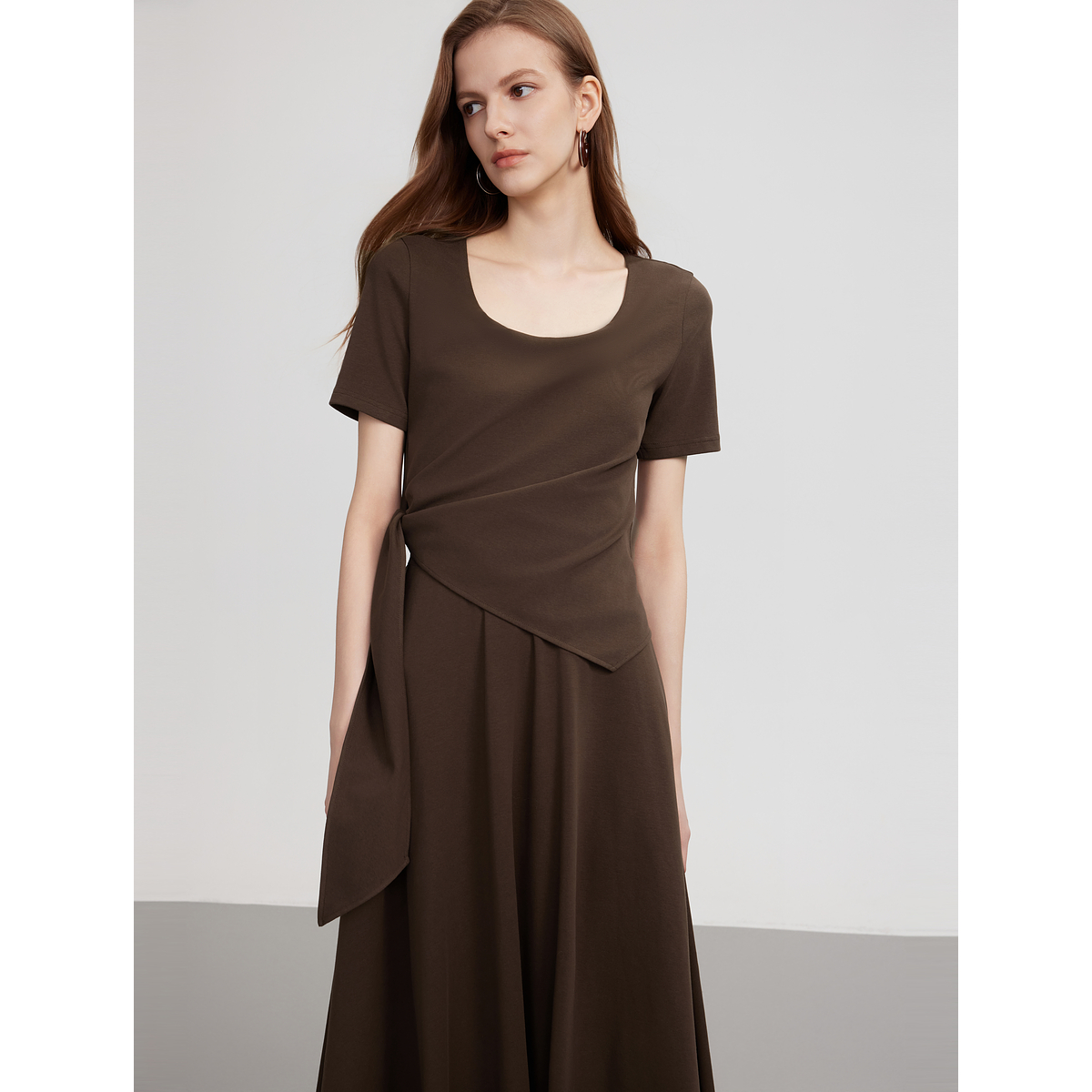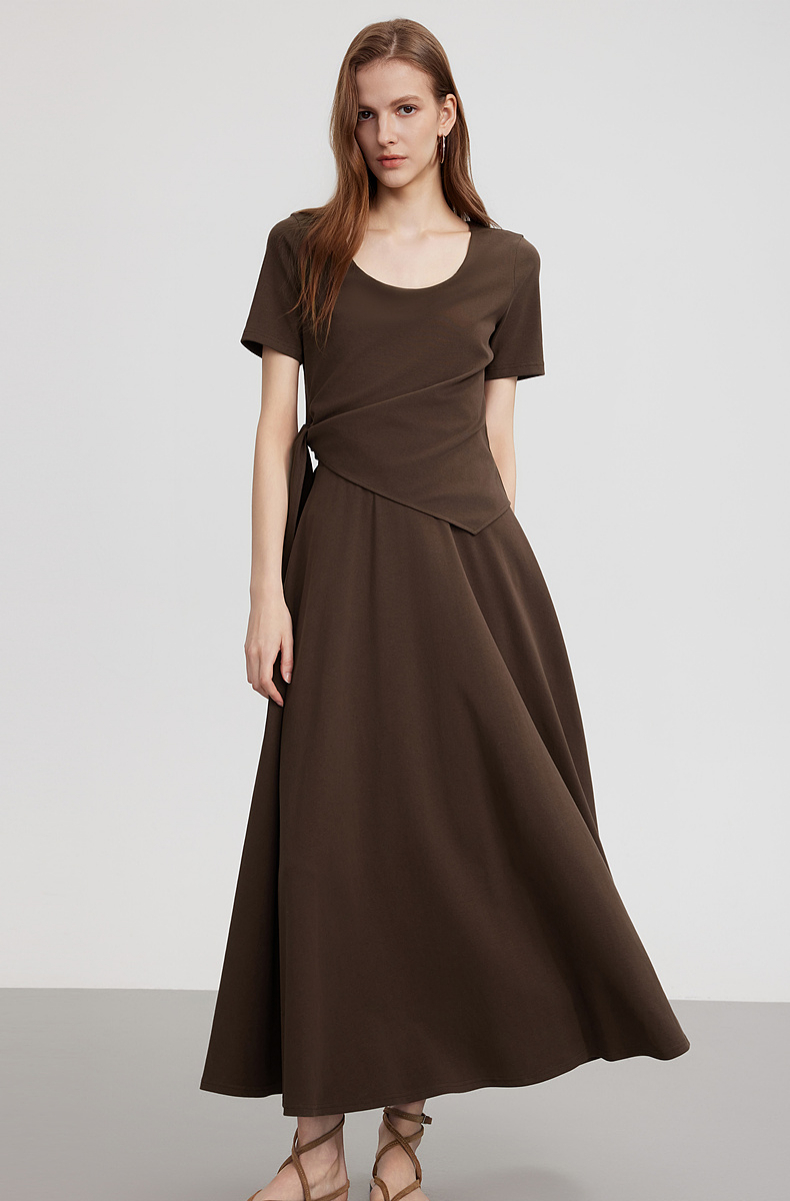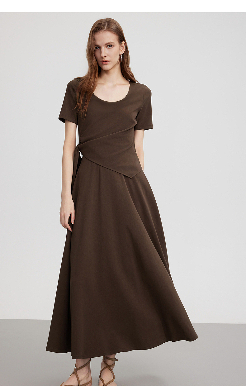 ELLE法式简约不规则连衣裙女2025夏季新款设计感咖色复古收腰长裙