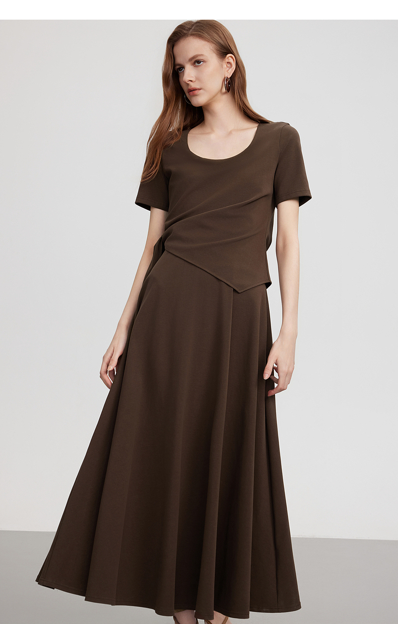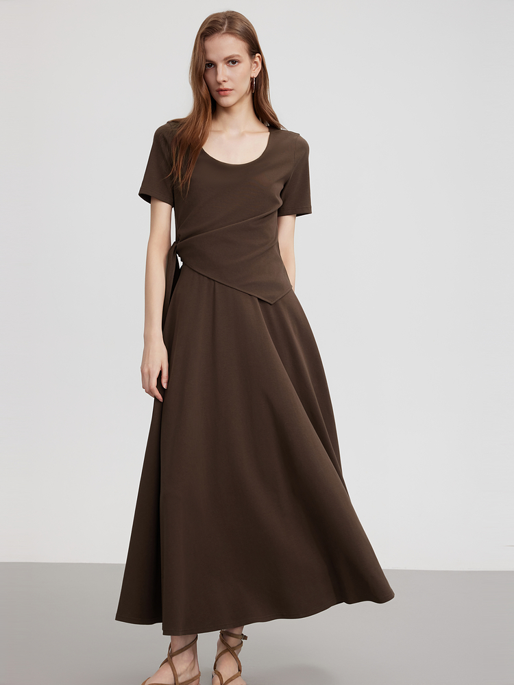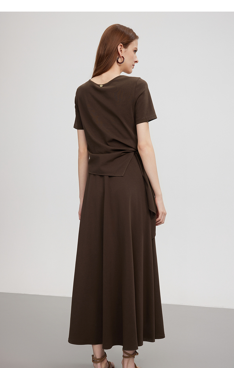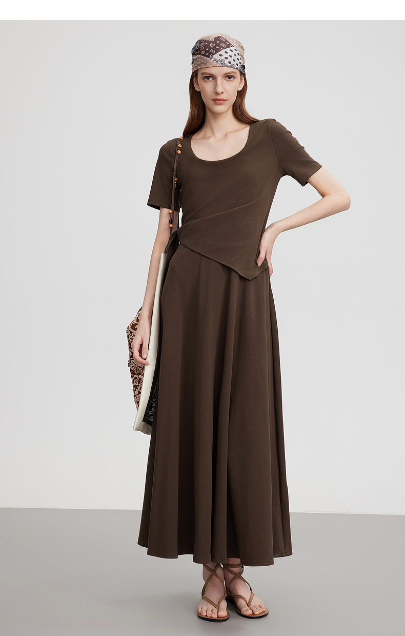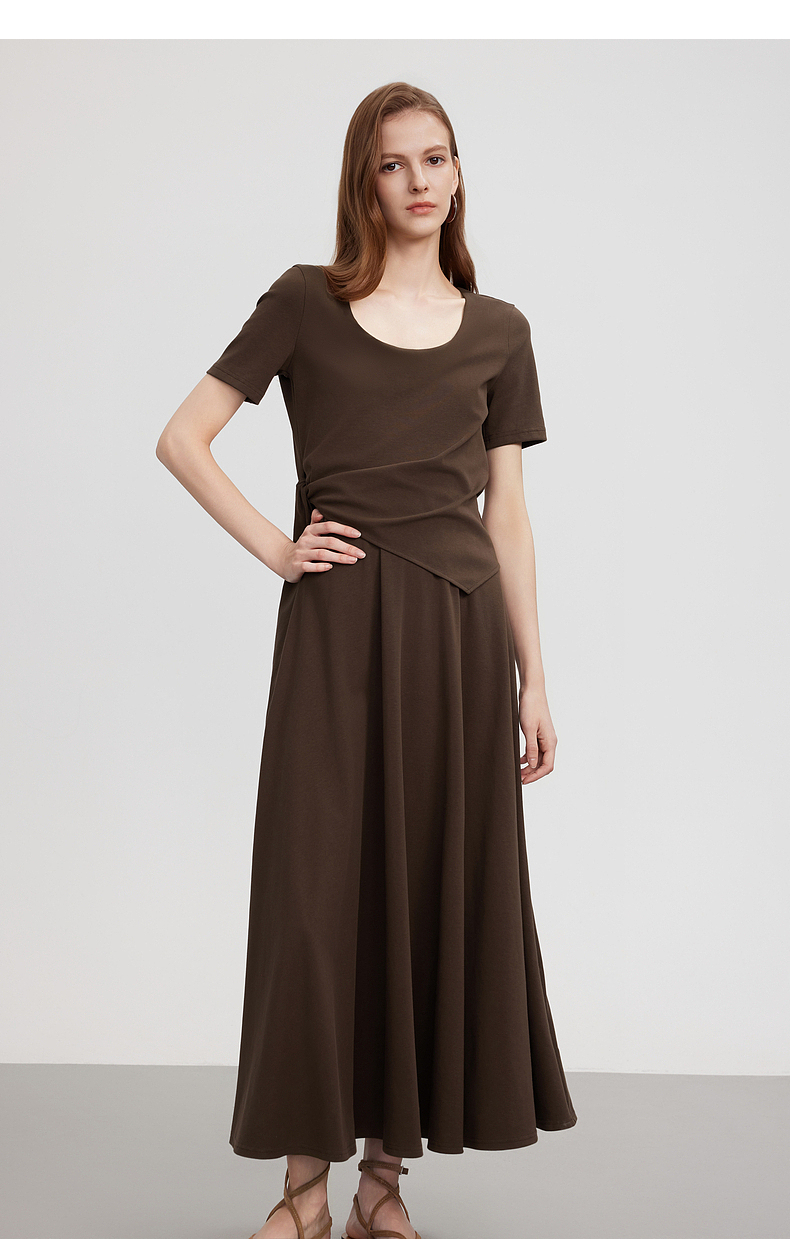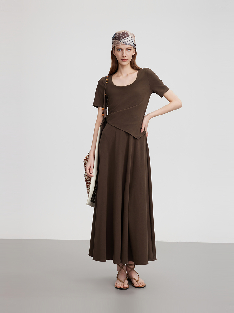ELLE法式简约不规则连衣裙女2025夏季新款设计感咖色复古收腰长裙